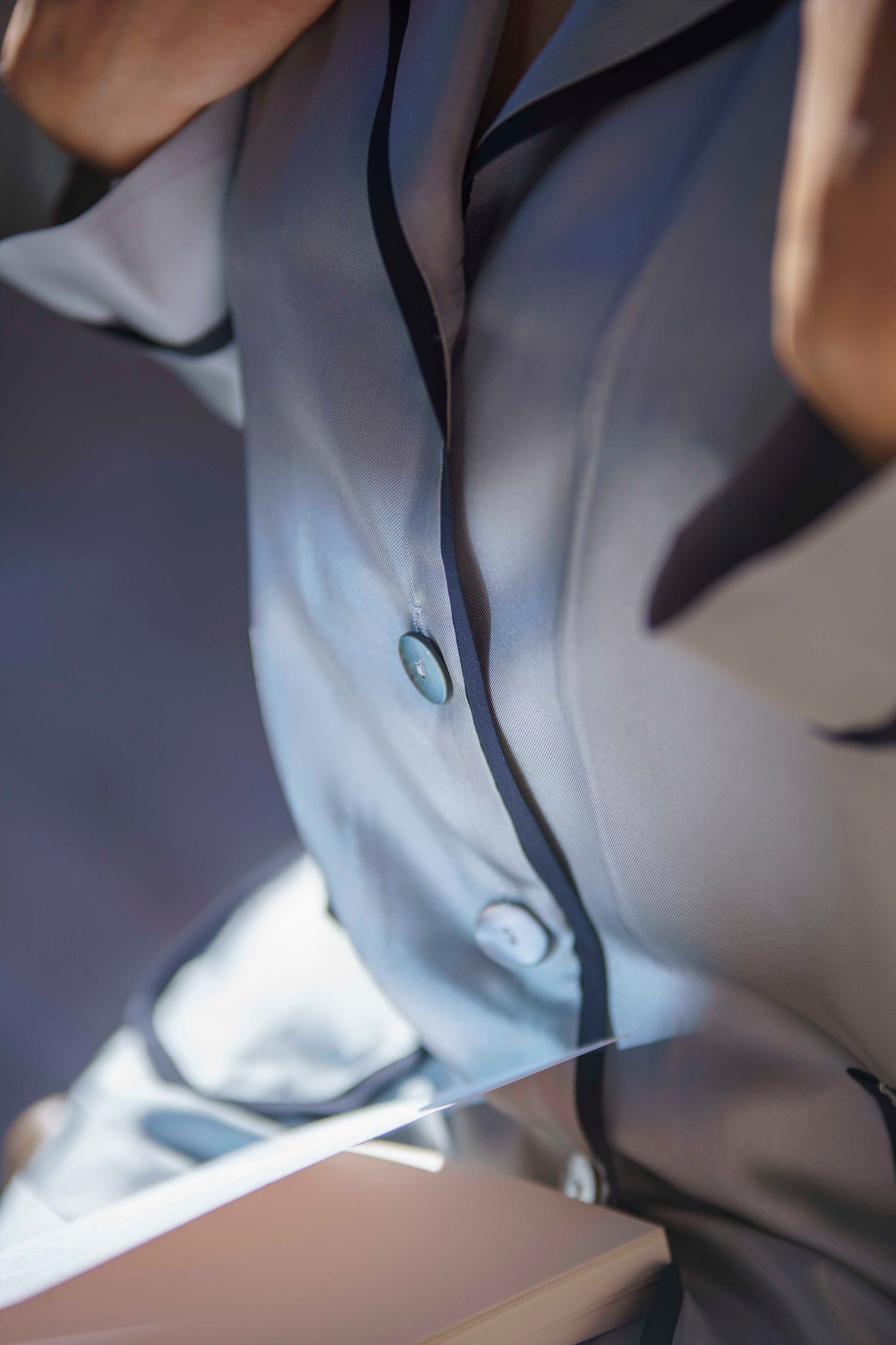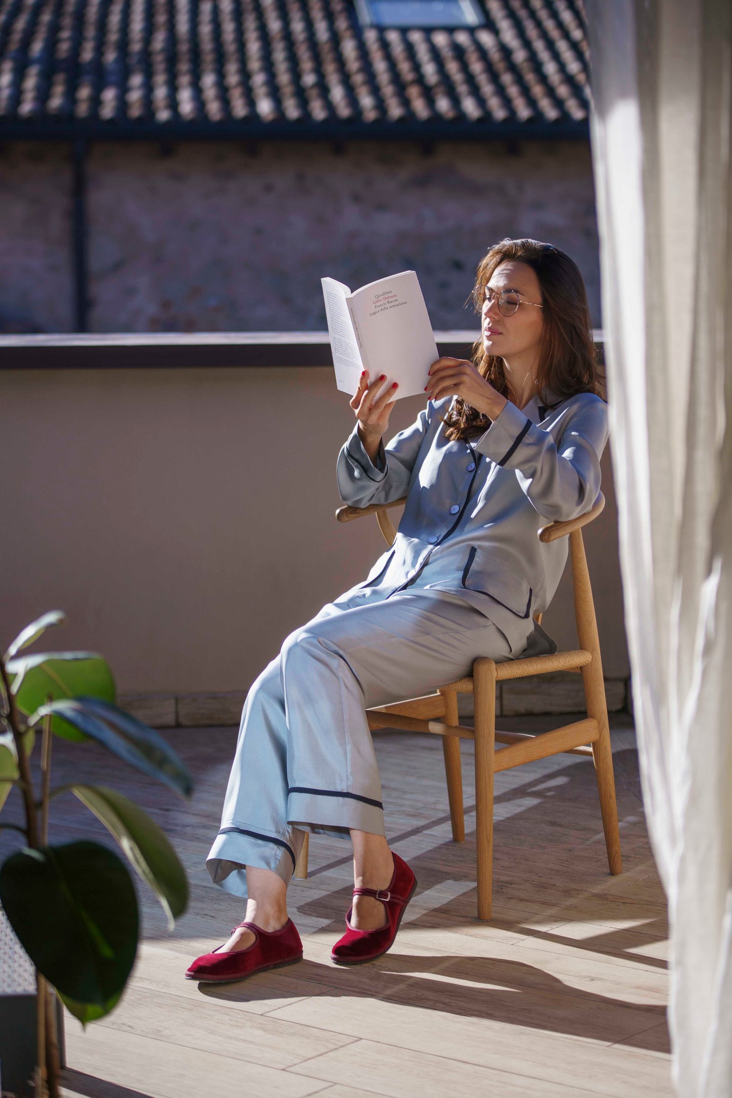 Il pigiama “Magia” è realizzato rigorosamente a mano in preziosa seta grigio perla e piping blu.